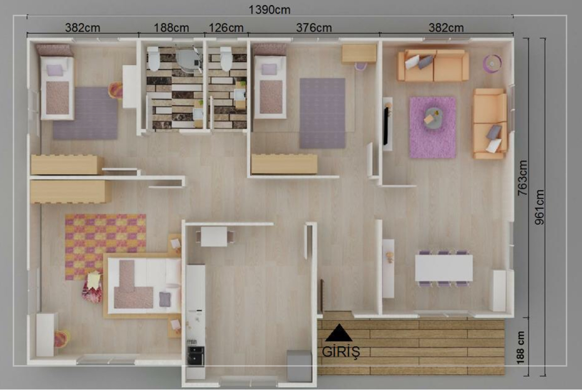 Вся сантехника проложена внутри панелей, с использованием ПВХ труб по стандарту TSE. В комплект входят унитаз, умывальник, душевая и смесители — всё сертифицировано по TSE.